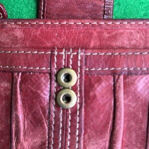Fossil vintage long wallet in Rich rust leather stylish pleated design on front with secure two snap closure inside a Paisley design 12 card slots and ID window center zip pocket two slip pockets for cash zip pocket on back slip pocket on front vintage so has wear and scoffing as shown in pictures but otherwise in good condition check all pics, comment with any questions