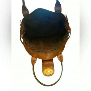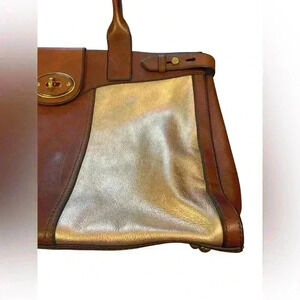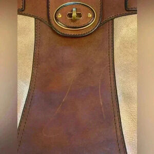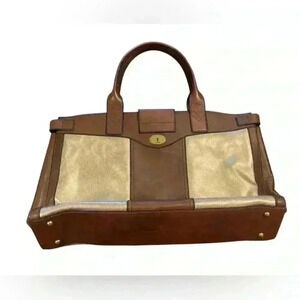 Item is from a smoke-free environment. Brown leather with champagne/rose gold shimmer leather. Very unique! Measures 5” depth by 18.5” length by 12” height. There are some minor scratches on the bag, shown in the photos.