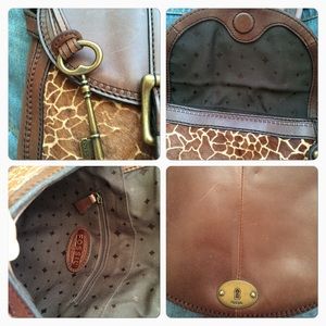 From FOSSIL's 2012 Vintage Revival collection. In very good condition. Pre-loved. Few scratches on front flap and back. Calf hair in excellent condition. Antique gold tone hardware, includes key hang tag. Revive your vintage-inspired style w/a touch of flair from this easy going crossbody! Smooth leather. Buckle-adjustable strap. Magnetic snap closure. Features back-wall zip pocket and slip pocket. Print-lined interior. Imported. L 8" H 8" W 2". Strap drop 23". Weight 14 oz.