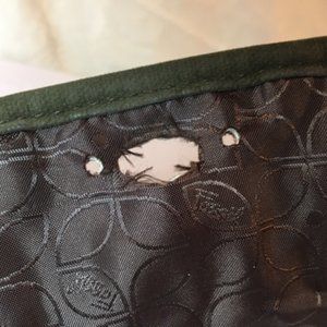 some wear, (material separation)on the faux leather on front opening where bag closes, some discolorations/stains on bag, interior clean (Please see last 5 pics)