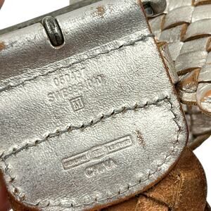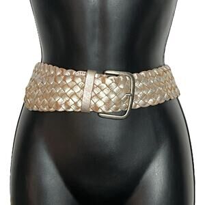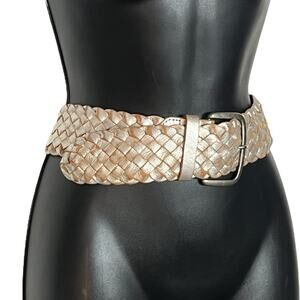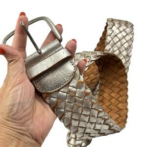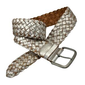 Up for sale, a very nice Fossil woven leather belt with a slightly distressed silver/brown finish. It is in very good preowned condition. It is marked a size M.