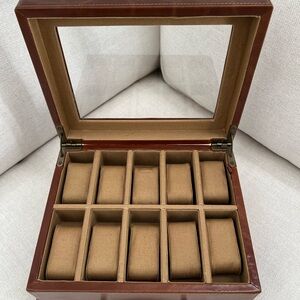 All leather watch box. Holds 10 watches. With additional pull out drawer. All leather-cognac color. In excellent condition.