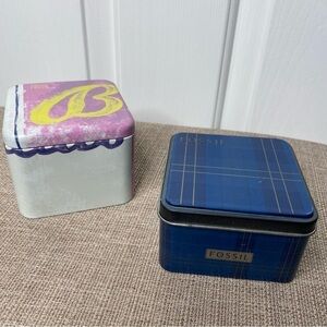 FOSSIL Watch Boxes - Blue Plaid, Pink Logo - set of 2 Tin boxes