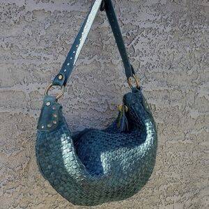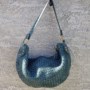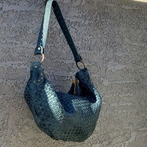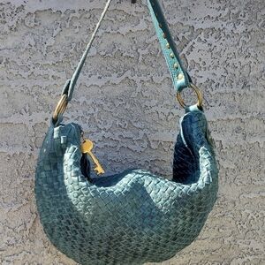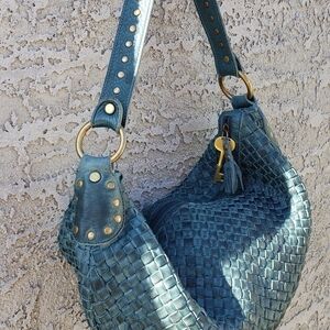 Fossil Teal Woven Leather Shoulder Bag with Stud DetailHeight From top of strap to top of purse is 7”