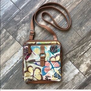 Fossil adjustable multi pocket iPad tablet floral crossbody purse bag