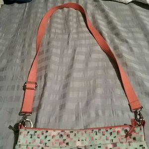 Neon, mint, grey and white patterned crossbody from fossil. Used off and on for one summer. No marks or stains. Normal wear on strap but will be cleaned before shipping. Great material and easy to whine down. Two pockets inside and one large pocket on the back side. 9.5/10. They no longer make this pattern from 2014 I believe