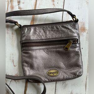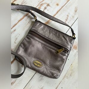 FOSSIL vintage 90s crossbody explorer bag leather purse metallic gun metal gray