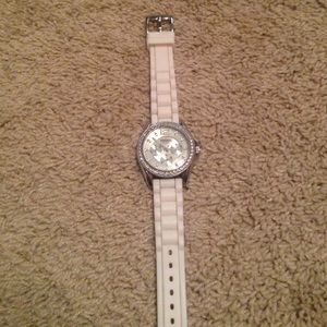 Very cute watch with diamonds around and white silicone watch band, barely worn but small minor scratches on back side