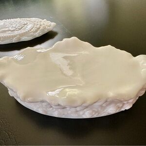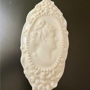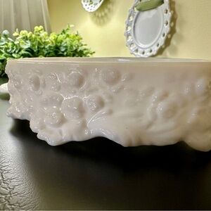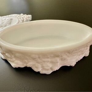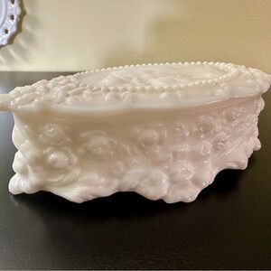 FOSTORIA, JENNY LIND, PRESSED, MILK GLASS, CAMEO, PIN BOX WITH LID. IN EXCELLENT CONDITION. MADE IN USA. 5 3/4”W X 2 3/4”D X 2”H