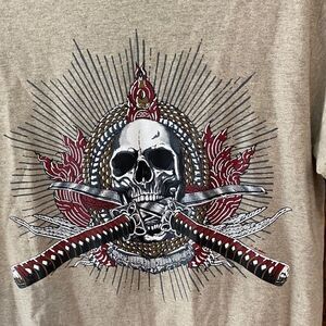 Brand new outrageous skull & sword design on a gray short sleeve T-Shirt