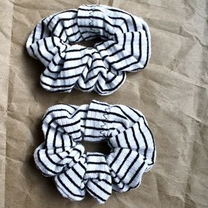 Facets: Two black and two striped (black & white) scrunchies made with recycled cotton material. Four low-waste scrunchies!