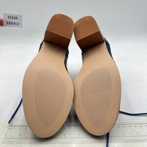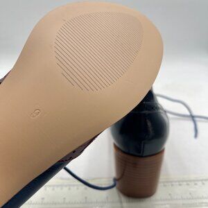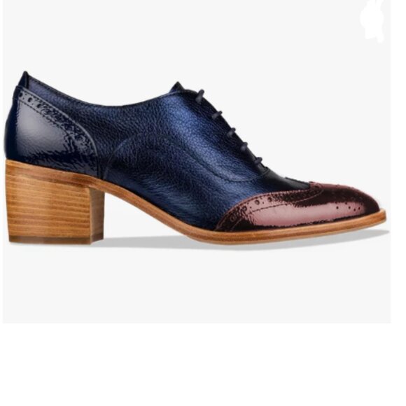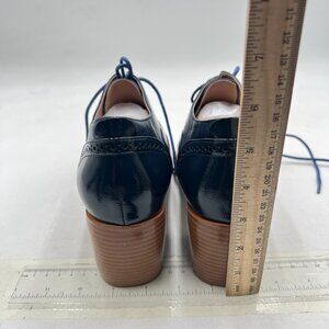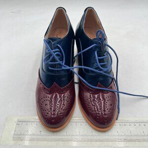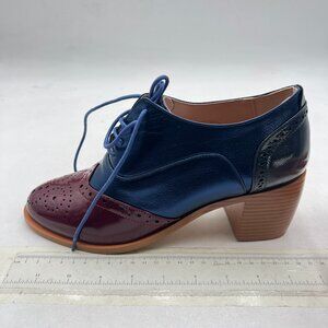 FOWT Blue Brown Perforated Lace-Up Oxfords Almond Toe Mid Chunky Heel Shoes