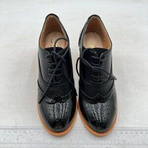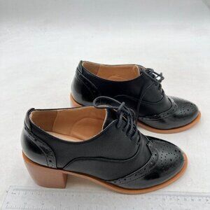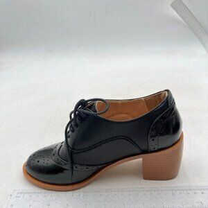 FOWT Women's Perforated Lace-Up Oxfords Almond Toe Mid Chunky Heel Derby Black