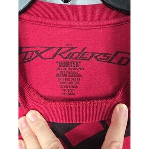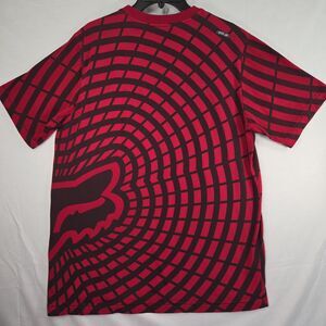 Y2K - FOX Riders Co Racing Vortex T-shirt. Dark red and black, all over print. Men's large. Very good pre-owned condition. There is a faded mark in the graphic on the right side front, at the side of the shirt. Please see the last pic. No stains, snags or holes. Non-smoking home. Measurements laying flat: