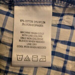 NAME: FOXCROFT NYC SHAPED BLUE WHITE STRIPED TUNIC 3/4 SLEEVES COVERED BUTTONS VNECK CAROLINA CRINKLE CASUAL OFFICE RELAXED FIT LIGHTWEIGHT