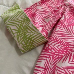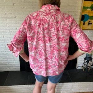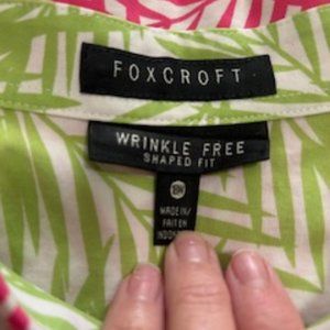 Beautiful Foxcroft button-down blouse with 3/4 sleeves. The outside of this blouse is a pink and white print and the inside of the collar, the flip-up sleeves and the inside of the button closure are all grean and white. Great contrast. Straight back, no darts. Size 18W. Like NEW condition