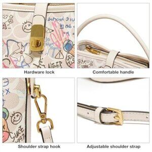 The FOXLOVER Coated Canvas Small Bucket Crossbody/Shoulder Bag Purse in Graffiti design is a stylish and versatile accessory for women. Made from durable canvas material with a coated finish, this small-sized bag features a unique graffiti pattern and gold hardware accents. It comes with a beige shoulder strap that is adjustable for added comfort. The bag has a zip and turn lock closure, making it secure for all your essentials. Perfect for on-the-go use, this fashionable bag is designed for both crossbody and shoulder carrying options.
