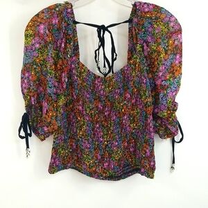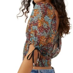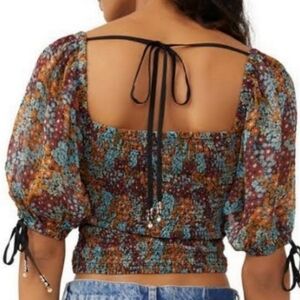 Free People Puffed Sleeves with Ties, Square Neckline, Smocked Bodice, Back Tie, Cropped Top. Floral Print. Gorgeous Colors! NWOT. Ready to Dress Up or Down!