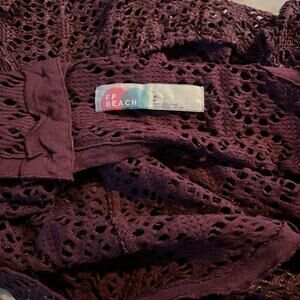 Three button closure above peek-a-boo back - metallic gold sheen on purple crochet lace - pockets!
