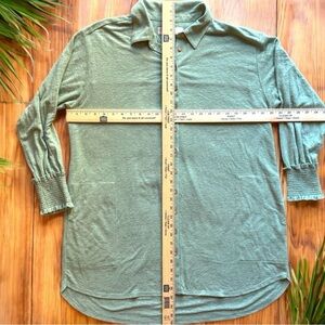 Free People, FP Beach, oversized shirt, tunic top, hi-low hem, boho casual, comfy lounge, sage green, long sleeve, smocked cuffs, collared knit, slub knit, relaxed fit, cottagecore