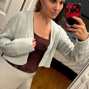 NWOT cropped length Declan cardigan sweater in Oxford Blue from FP Beach by Free People. 100% cotton. Bluish/Mint green color. Longer length sleeves. Size medium but fits tight so more like a small.