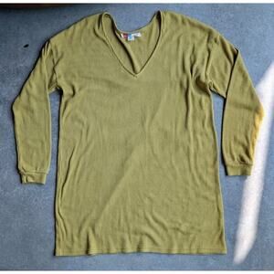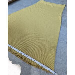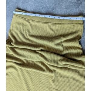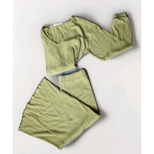 Ribbed texture. This is in excellent, pre-owned, condition. However, there is some very light pilling. The color was difficult to photograph accurately. It is an olive green, that leans much more towards the green spectrum and not the yellow spectrum. So a greeny olive. Ultra soft fabric. Elastic waist on skirt. Skirt has ruffle detail along the bottom seam. Stretchy and comfortable material.