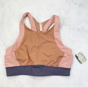 Free People Colorblock Sports Bra. High-Neck. Breathable Cutout at Back. Compressive Fit. Elastic Bottom Band. Racerback Straps. Lined Bust.Keyhole Open Back Strappy Details. Pastel Casual Dusty Mauve Pink, Earthy Terracotta Blush, and Purple. Cute & Comfy. Stretchy. NWT / New With Tags. Great Condition. No Stains or Rips.