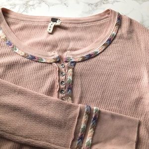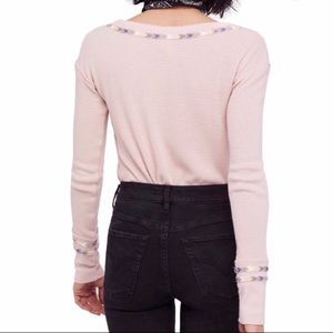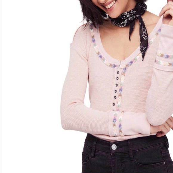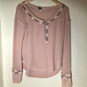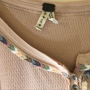 Super cute thermal with rainbow 🌈 detail stitching. Size small. Washed cold, air dry. Approx 18.5 across the chest and length in the front is 22 in and 24 in the back.