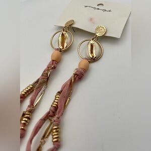 FP Free People dangle drop earrings, features rose gold dipped cowrie shell, pink ribbon w/tinsel, drop chain. Approximately 9” drop.