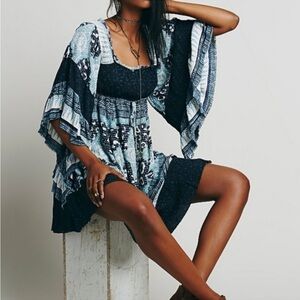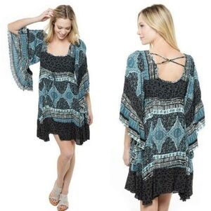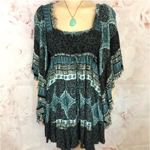 100% rayon. Lightweight, flowy material with no stretch. Machine washable. Large, dramatic bell sleeves, scoop neck, and criss-cross scoop back.