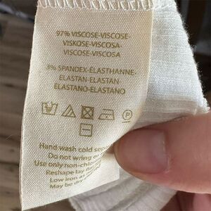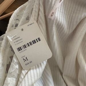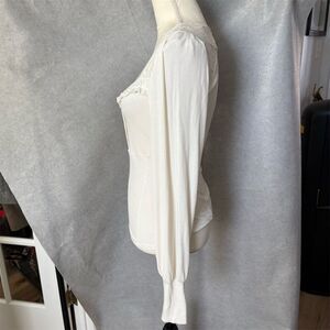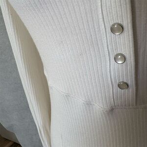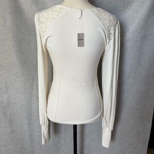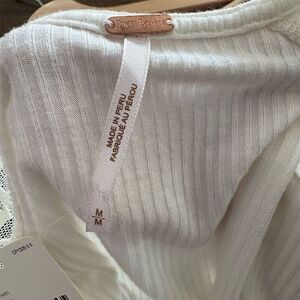 This Free People blouse in size M is a women's regular fit, featuring a solid white color and a basic style. Made from a blend of viscose and spandex, it offers a slim fit with a ribbed fabric type. The blouse has a square neckline, long sleeves, and button accents, complemented by lace frill details. Manufactured in Peru, it is suitable for casual outings or semi-formal occasions. The blouse still has its tags but there is a small mark on the front. Should come off with a wash.