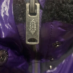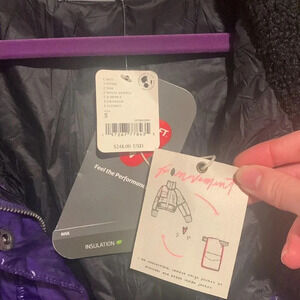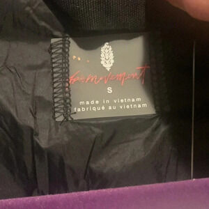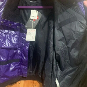 NWT Fp Movement Vagabond sherpa jacket in purple and black. Nylon material featuring pockets, adjustable side straps, high neck option, button and zip up closure and a removable hanging pouch on the right chest. No callouts to note, just fits oversized for a small as is typical with this brand. Stock photo added from the website for reference.
