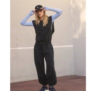 Designed to be thrown on over your favorite workout set this easy onesie is featured in a breathable fabrication and sleeveless silhouette with a cinched waist and billowy legs.