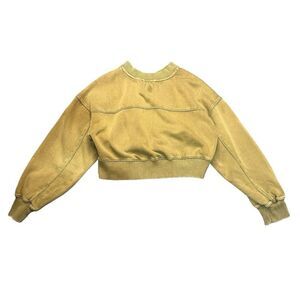 Features a distressed green color. Long sleeves. Cropped fit. Ribbed waist and cuffs. Measurements in pictures.