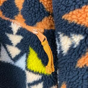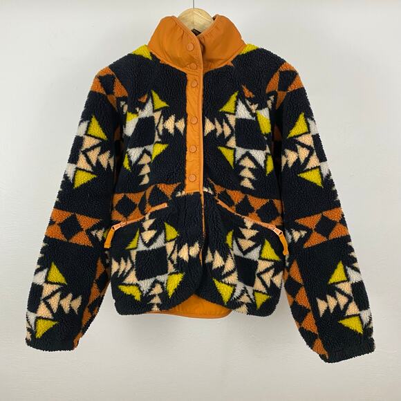 Long sleeve fleece jacket featured in a colorful geometric pattern with zipper pockets, full button-front closure, and elastic cuffs. FP Movement buti logo on back of collar, zipper pulls, and buttons.