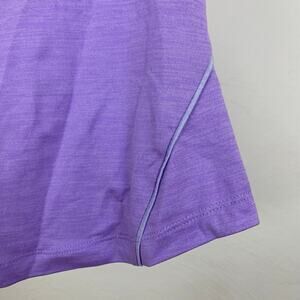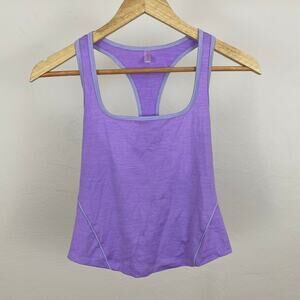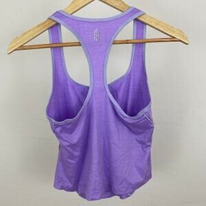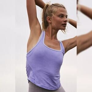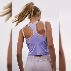 Cropped racerback tank top with a square neckline and contrast seam detail. Heathered purple. FP Movement Buti logo on back. Has stretch and is super comfy.