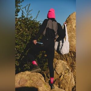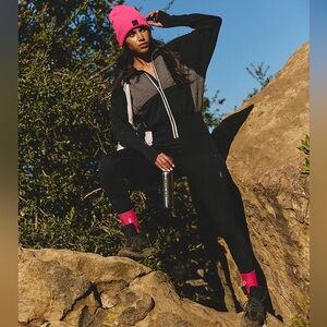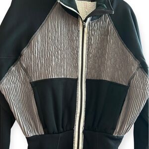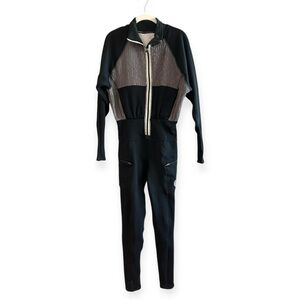 Features: Zip-front closure; reflective detailing at front zip; exaggerated collar; thumbhole detail; relaxed top; fitted leggings at bottom; zip pockets at sides