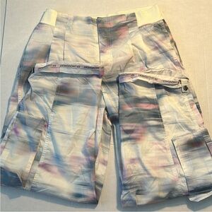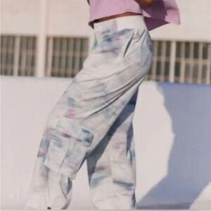 Features: Lightweight nylon fabrication, printed design allover, stretchy elastic waistband with ribbed knit detailing, oversized pockets, cargo-inspired pocket at leg, pleated detail, snap-button detail at bottom of legs.