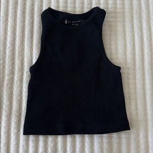 Sleeveless ribbed racerback crop tank. Fitted, stretchy fabric. Small white decorative logo at upper back. Versatile everyday staple. Size M/L but runs small in my opinion.