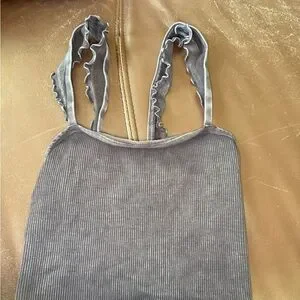 Grey ribbed tank top with ruffled straps for a chic look. Perfect for casual outings. Super comfy. Worn but in great shape! See pictures for all updates. Slight fading look towards the bottom but that’s how FP stuff gets when you wash it.