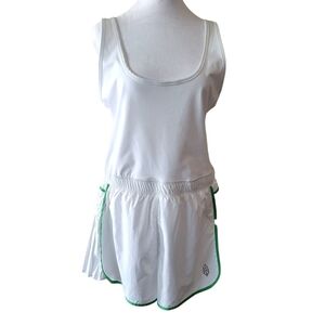 This FP Movement Easy Tiger Shortsie Romper in white with green trim is designed for activewear and features a form-fitting bodice, smocked waist, and a pleated skirt overlay. It is made from lightweight, breathable fabric and has built-in briefs for added coverage. This romper is popular for its versatility and comfort, suitable for workouts or casual wear.