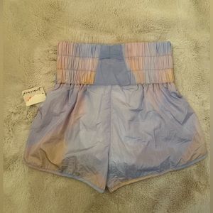 Speed up or slow down in these breezy, warm-up style printed running shorts, featuring a boldly smocked waistband with a high-rise silhouette and split hem.