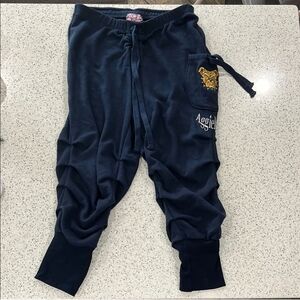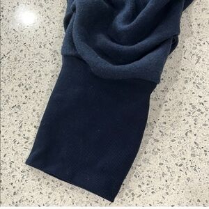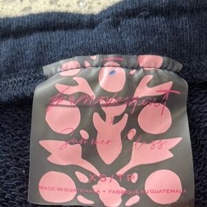Free people movement New without tags, by Free people movement ,on chill scrunched joggers navy blue with an embroidered dog on the side pocket, usable pocket, has a tie that adjusts closure of pocket, has a logo of, Aggieland , elastic waistband with adjustable tie, that scrunches up, adjustable tie, soft to touch, has embroidered emblem on them, has ribbed large cuffs on bottom. 50% cotton 50% polyester