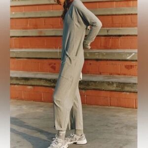 Your favorite onesie is now cold-weather ready--perfect for layering on post-sweat sesh, this soft and comfy long-sleeve onesie features a slouchy, relaxed-fitting design with a dropped crotch and convenient side pockets. • Hooded neckline • Thumbholes at sleeves • Oversized patched pockets Care + Content Machine Wash Cold Import • 95% Cotton, 5% Elastane