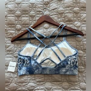 Stylish blue tie-dye sports bra with crisscross back. Ideal for active wear.