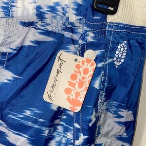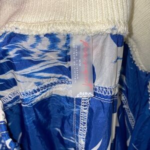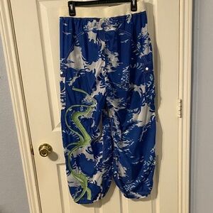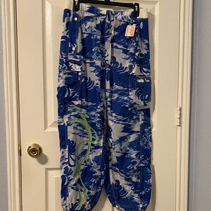 Stylish blue and green pantsuit. Features abstract patterns. Comfortable fit.