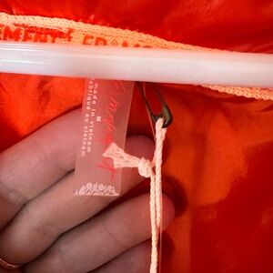 Vibrant orange jacket. Lightweight and stylish. Perfect for active wear.