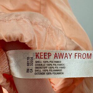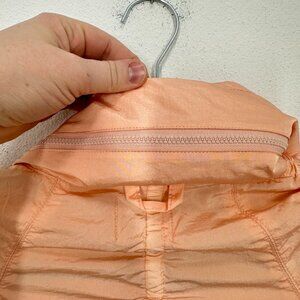 Lightweight peach jacket. Features ruched sleeves and drawstring hem. Perfect for layering.