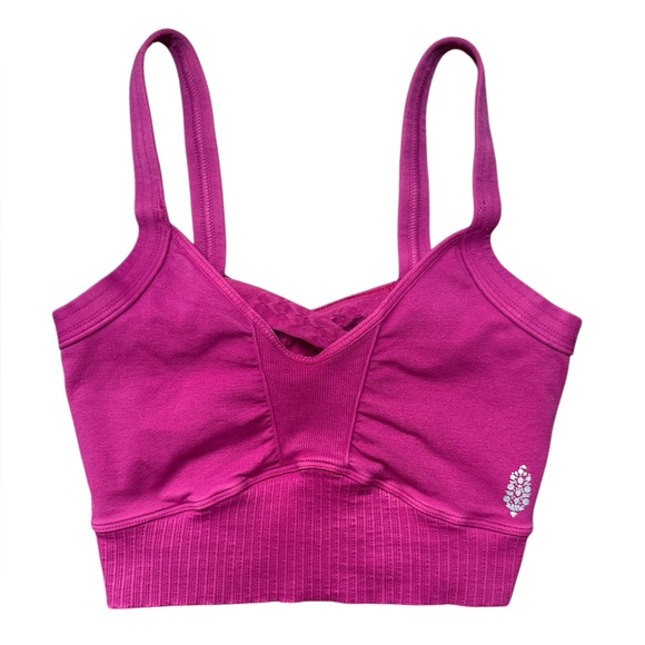 Vibrant pink sports bra. Features ribbed band and crisscross front. Comfortable and stylish.