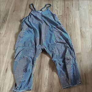 Stylish hard to find geometric patterned jumpsuit with bold blue/navy and black/grey stripes. Perfect for a day off from work, casual outing or simple modern relaxed look.